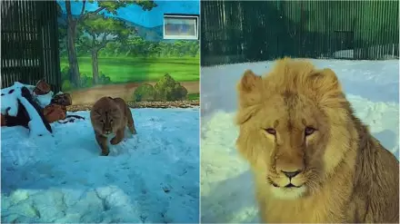 В зоопарке Алматы показали, как львенок Симба переживает свою первую зиму, передает Tengrinews.kz.