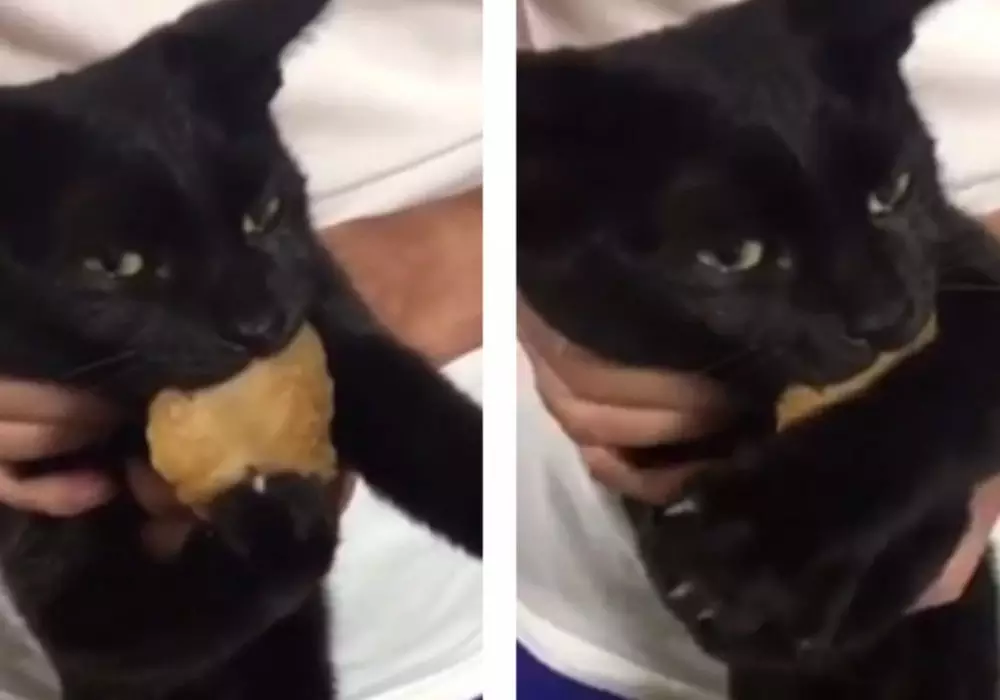 В ролике, опубликованном в закрытой группе в Facebook, питомец зубами вцепился в кусочек еды, и при попытке мужчины вырвать лакомство кот обнял сворованное, чтобы защитить добычу.