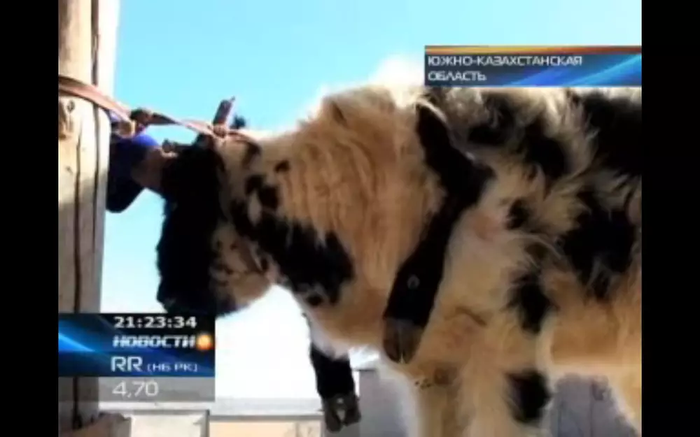 В Южно-Казахстанской области в Сайрамском районе живет теленок с тремя парами ног и тремя рогами, передает телеканал КТК. Необычное животное появилось на свет еще полгода назад, однако его хозяин держал это в тайне. Возле шеи у Артыкая растет еще одна пара ног, а на голове пробивается третий рог. Мужчина намерен сам растить теленка, однако не будет против, если его питомца захотят обследовать ученые. "Я сразу понял: это божий промысел, это хороший знак. У Артыкая три пары ног и три рога, а в остальном он такой же теленок, как и остальные - так же бегает, резвится, ест, пьет. Я его никому не отдам, буду сам выращивать", - говорит хозяин теленка Абдрашит Абдухамитов.