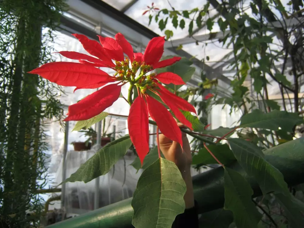 "Этот цветок считается символом Рождества. Рождества не только католического, но и православного. Когда я привез его, было много проблем - он и замерзал, и погибал, но мы его всегда выхаживали, и вот теперь он у нас вырос до 7 метров", - рассказал ведущий агроном ботанического сада Равиль Рязапов. В европейских странах пуансеттию принято дарить именно на Рождество.