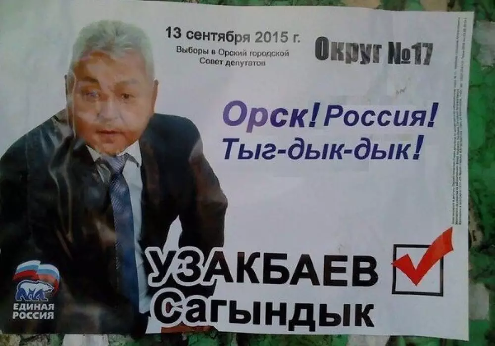 В России благодаря фейковой предвыборной листовке прославился кандидат в депутаты городского совета Орска (Оренбургская область), директор лицея, член партии "Единая Россия" Сагындык Узакбаев. Изображение с необычным лозунгом "Орск! Россия! Тыг-дык-дык! Узакбаев Сагындык" мгновенно разошлось по многим социальным сетям, сообщает издание Урал56.Ру.