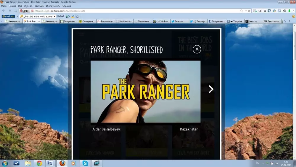 В марте были открыты шесть вакансий: фотографа-натуралиста, аниматора, рейнджера национального парка, дегустатора, смотрителя за дикими животными и искателя приключений. За полгода работы победители получат по 100 тысяч долларов. Свои кандидатуры выдвинули 45 тысяч человек со всей планеты. В шорт-лист вошли всего 150 претендентов, в том числе и Байсалбаев. Промо-ролик казахстанца можно посмотреть здесь.