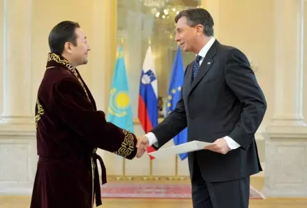 Это фото сделано во время вручения Сарыбаем верительных грамот президенту Словении Боруту Пахору. Как отмечается на сайте Министерства иностранных дел Казахстана, в ходе встречи казахстанский дипломат передал приветствия Президента Республики Казахстан Нурсултана Назарбаева словенскому лидеру.