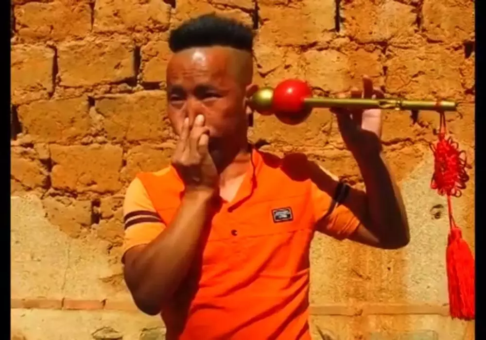 Китаец пьет ухом воду и играет им на дудочке Кадр из видео