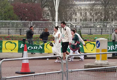 И марафон выиграл и женой обзавелся. Речь о жителе Филадельфии Брайане Питкэрне, который сделал предложение своей возлюбленной прямо во время забега. А точнее у финишной прямой. Прибежал, отдышался, и всего за несколько метров до финиша встал на колено и попросил Кэти Пеллани, также принимавшую участие в марафоне, стать его женой. Зрители замерли в торжественном ожидании. Кэти, набрав воздуха, как и полагается в прекрасной сказке ответила протяжным "Да"! Затем спортивная и счастливая пара, взявшись за руки, пересекла финишную прямую. Менее проворные участники забега, подоспев к финишу, наблюдают такую картину: толпа ликует, двое участников целуются, финишная ленточка - порвана. Всего спортсменов в филадельфийском марафоне оказалось около 20 тысяч человек - опытные бегуны-любители, дебютанты, а также профессиональные спортсмены. Некоторые из них всю дистанцию преодолеть не смогли, однако это было не обязательно - подобные забеги проводятся вовсе не с соревновательной целью. Скорее с целью пропаганды здорового образа жизни!