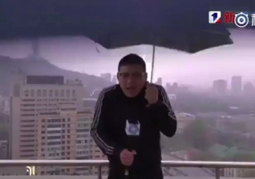 На видео, появившемся в Сети, видна яркая вспышка в момент эфира, после чего диктор закричал и бросил зонт, в который, предположительно, попала молния. "Моя рука онемела, я видел желтые искры, как от электричества, на своей руке и рукояти зонта", - рассказал Лу Сяодун.