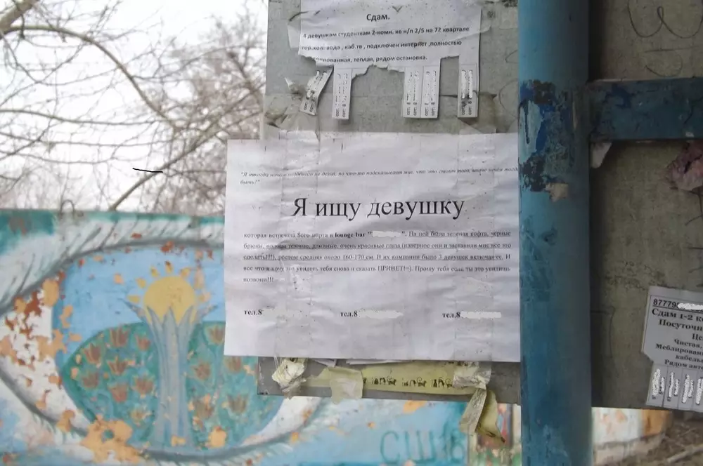 На автобусных остановках Семея появились необычные объявления с заголовком: "Я ищу девушку", передает корреспондент Tengrinews.kz. В объявлении сказано, что молодой человек ищет девушку, которая вместе подругами отмечала 8 марта в одном из баров города. "На ней была зеленая кофта, черные брюки, волосы темные, длинные, очень красивые глаза (наверно они и заставили мне все это сделать) ростом средняя около 160-170 сантиметров", - пишет парень. "И все что я хочу это увидеть тебя снова и сказать: привет! =)", - говорится в объявлении. При этом молодой человек признается, что никогда подобным образом не знакомился с девушкой, и просит ее откликнуться.