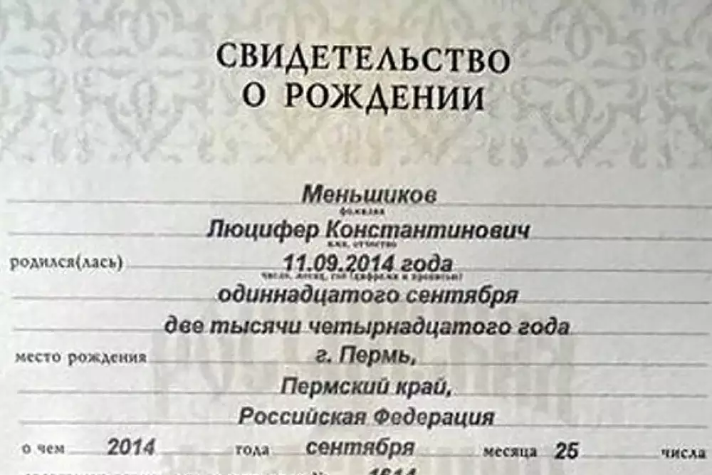 В Перми молодая супружеская пара назвала родившегося сына именем Люцифер. Свидетельство о рождении ребенка было выдано одним из городских ЗАГСов 25 сентября 2014 года, сообщает местное интернет-издание PRM.ru.