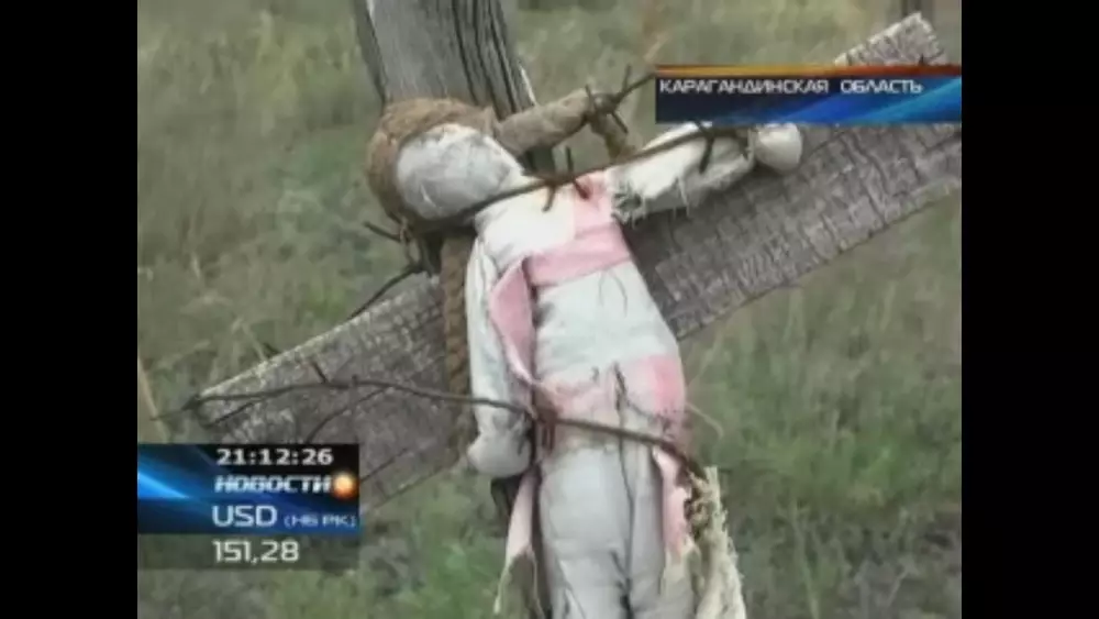 В Карагандинской области жители поселка Малая Сарань обнаружили жуткое место: на обнесенном колючей проволокой участке кто-то разложил десятки деревянных крестов с номерами и привязанными к ним тряпичными куклами, сообщает телеканал КТК. Сельчане не на шутку перепуганы. "Может, черной магией кто-то занимается тут, но кто его знает. Если действительно какая-то секта, нам просто страшно за детей наших", - говорит местная жительница Алла Штауберг. Люди боятся даже проходить мимо этого зловещего места. Местная гадалка считает, что "кладбище" - дело рук колдуна, а расположенные на перекрестке кресты удобны для работы с нечистой силой. Также существует версия, что это декорации для какого-то фильма. Однако почему их не разобрали, непонятно. Валентина Островерхова выражает общее мнение: "Нам жутко. Такого безобразия не было никогда. Может, колдовство какое или порча на нас".