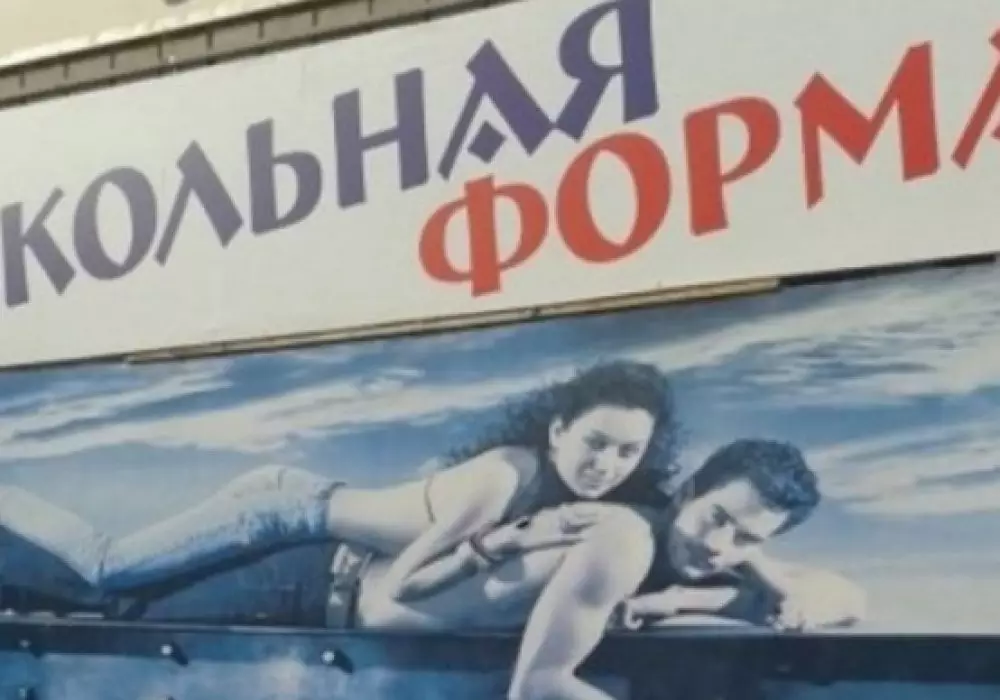 Как отмечает телеканал, магазин, на стене которого разместили баннер, действительно продает школьную форму. Но чтобы увидеть на баннере скромно одетых мальчика и девочку, а не расположенную внизу парочку, нужно отойти на значительное расстояние.