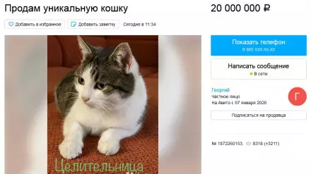 Житель Новороссийска опубликовал объявление о продаже "уникальной кошки" за 20 миллионов рублей (122 миллиона тенге), сообщает Tengrinews.kz со ссылкой на РИА Новости.