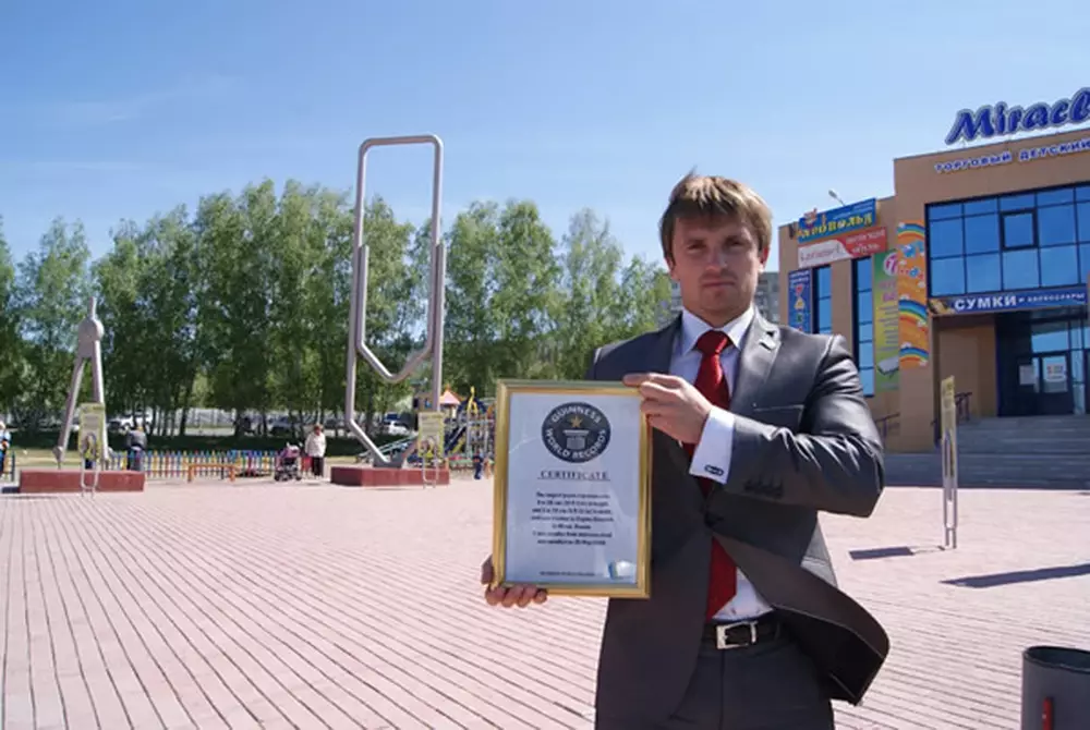 Высота стальной скрепки-рекордсмена составляет 9 метров 28 сантиметров. В парке также установлены четырехметровые ножницы и циркуль, кнопка диаметром два метра и линейка-ростомер высотой около трех метров.