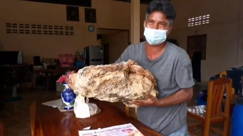 Житель тайской провинции Сураттхани, местный рыбак Наронг Плетчараджа нашел 30-килограммовый кусок окаменевшей рвоты кашалота. Это вещество называется "амбра" и высоко ценится в парфюмерии, цена за килограмм - 40 тысяч долларов. Плетчараджа продемонстрировал рвоту местным жителям и даже дал потрогать, а теперь надеется ее продать.