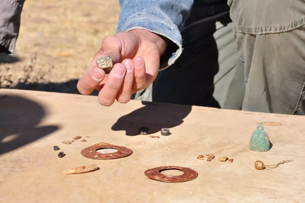 На месте раскопок найдены скелеты двух человек. Останки женщины, которая по мнению ученых, была рабыней, сохранились, а вот скелет мужчины разбросан по могильнику. Еще более удивились археологи, когда в погребении обнаружили два золотых диска, которые датируются 4-2 веками до нашей эры.