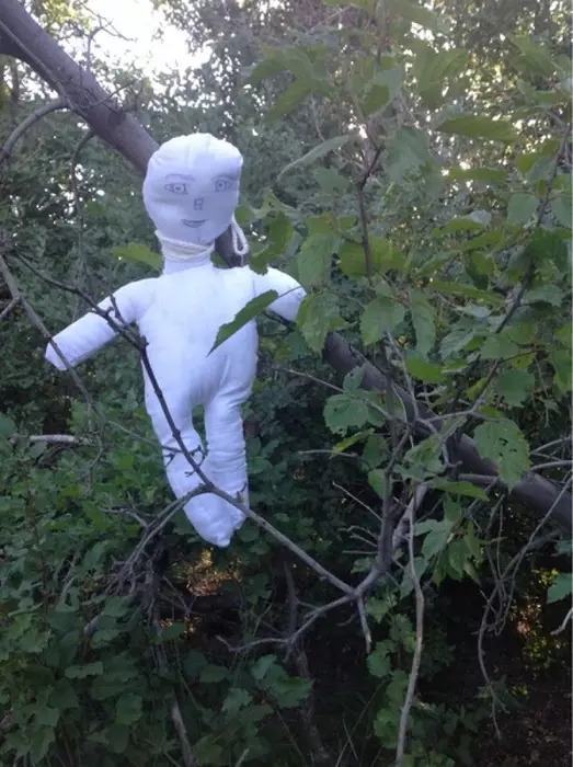 По его словам, жутковатые на вид куклы "привязаны соответствующего цвета веревками за горло к веткам деревьев и повернуты лицом к месту аварии". "Что интересно: вокруг пыль, но куклы абсолютно чистые, новые, будто бы их повесили буквально час назад и пыль не успела на них сесть", - сказал Арыстанов.