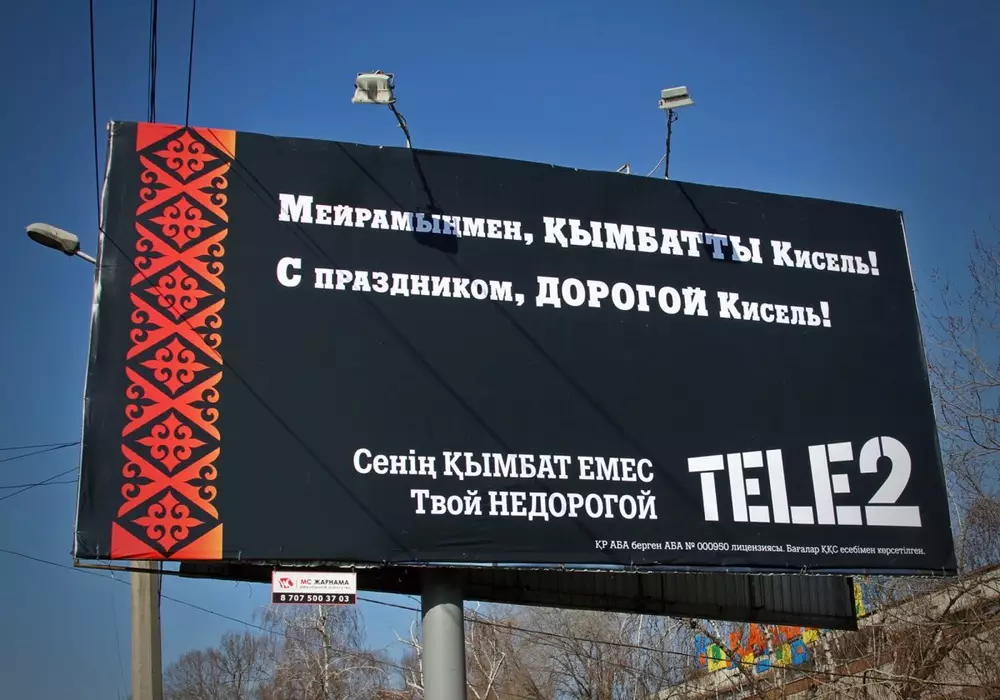 В Алматы появился очередной билборд с провокационной рекламой от сотового оператора Tele2, передает корреспондент Tengrinews.kz. Баннер появился на улице Тимирязева напротив КазНУ имени аль-Фараби. Компания разместила оригинальный билборд, содержащий поздравления с праздником Наурыз для конкурентов. На плакате написано: "С праздником, дорогой Кисель! Твой недорогой Tele2".
