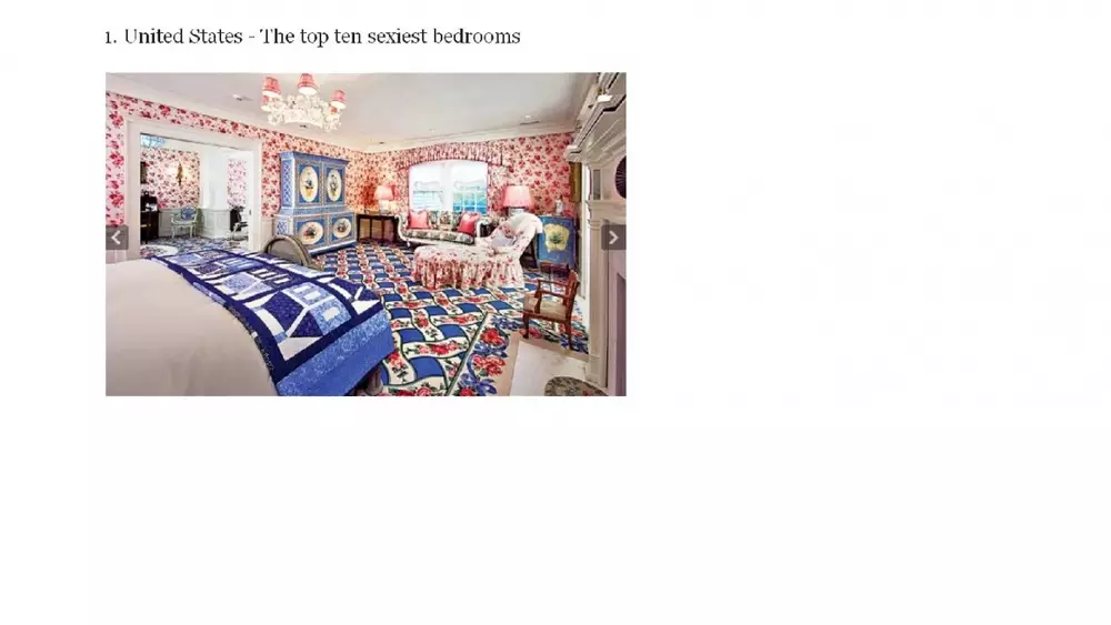 Британская газета The Daily Telegraph составила список самых сексуальных спален в мире. Возглавила список спальня из 9-комнатной квартиры в США. Ее дизайн выполнен в приглушенных тонах и строгом стиле. Второе место досталось спальне, которая находится в доме графства Сомерсет на юго-западе Англии. В первую очередь привлекает дизайн, выполненный в стиле прошлого века. Деревянная мебель, старинные абажуры, тумбы и исторические картины делают спальню более привлекательной и желанной. На третьем месте расположилась огромная спальня из Франции, которая выполнена в классическом стиле. Все спальни можно посмотреть здесь.