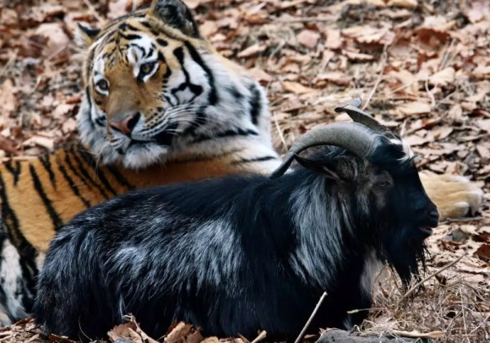 Напомним, неожиданная дружба тигра Амура и козла Тимура в дальневосточном сафари-парке продолжается уже около двух месяцев. Животные все это время живут в одном вольере, часто гуляют вместе. При этом грозный хищник не проявляет к храброму козлу никакой агрессии.