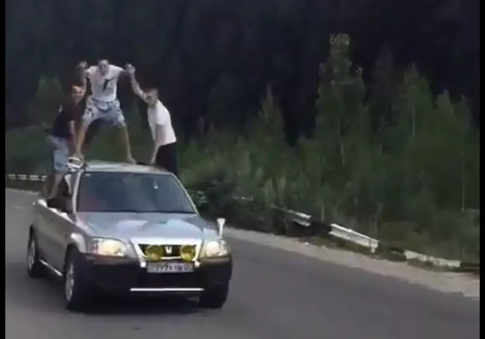 Трое парней прокатились верхом на авто в Алматы Кадр из видеоролика