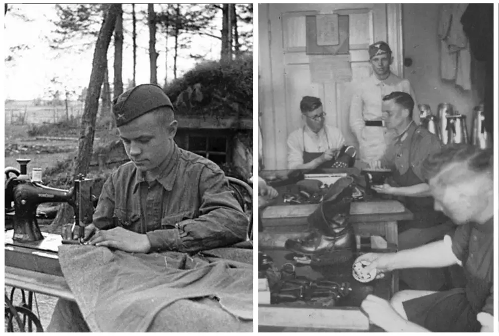 Многое в солдатском быту, да и на фронте зависело от обмундирования. Из воспоминания бойца Ленинградского фронта 1025-й отдельной минометной роты Ивана Мельникова: "Выдавались нам кальсоны, рубашка, гимнастерка суконная, ватник и штаны ватные, валенки, шапка-ушанка, рукавицы. В таком обмундировании можно было воевать и в сорокаградусные морозы. В отличие от нас немцы были одеты крайне легко. Одеты они были в шинели и пилотки, сапоги. В особо лютые морозы они укутывались в шерстяные платки, обматывали ноги тряпками, газетами, лишь бы спастись от обморожения. Так было в начале войны под Москвой и позднее - под Сталинградом. Немцы так и не смогли привыкнуть к русскому климату".