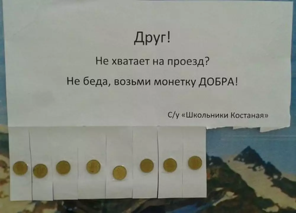 Необычные объявления стали появляться на остановках в Костанае: "Друг, не хватает на проезд, не беда - возьми монетку добра!" с подписью "Школьники Костаная". Внизу объявления скотчем приклеены монетки номиналом в один тенге. Об этом сообщает телеканал "Астана".