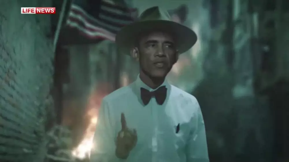 За Обамой то и дело взрываются жилые и административные здания, машины, ездит тяжелая военная техника. Но это ничуть не беспокоит американского лидера, судя по его счастливой улыбке и веселым танцам.