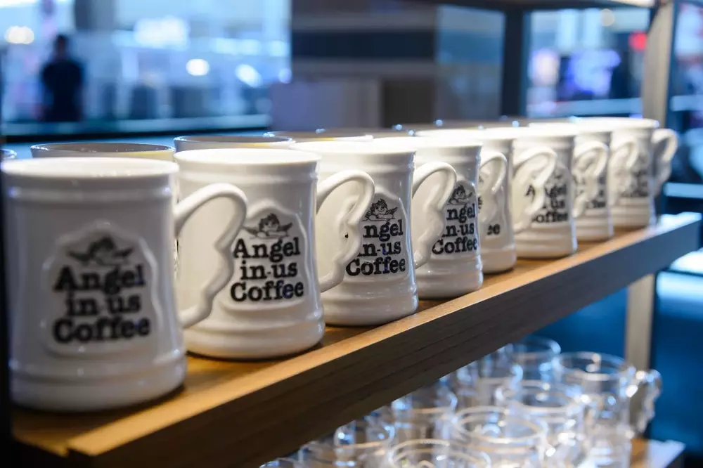 Кофейни Angel-in-us выдержаны в европейском стиле и включают три зоны: take away - для тех, кто хочет купить кофе или десерты "с собой", study zone - для тех, кто хотел бы поработать или позаниматься в кофейне, lounge zone - для комфортного времяпрепровождения с друзьями.