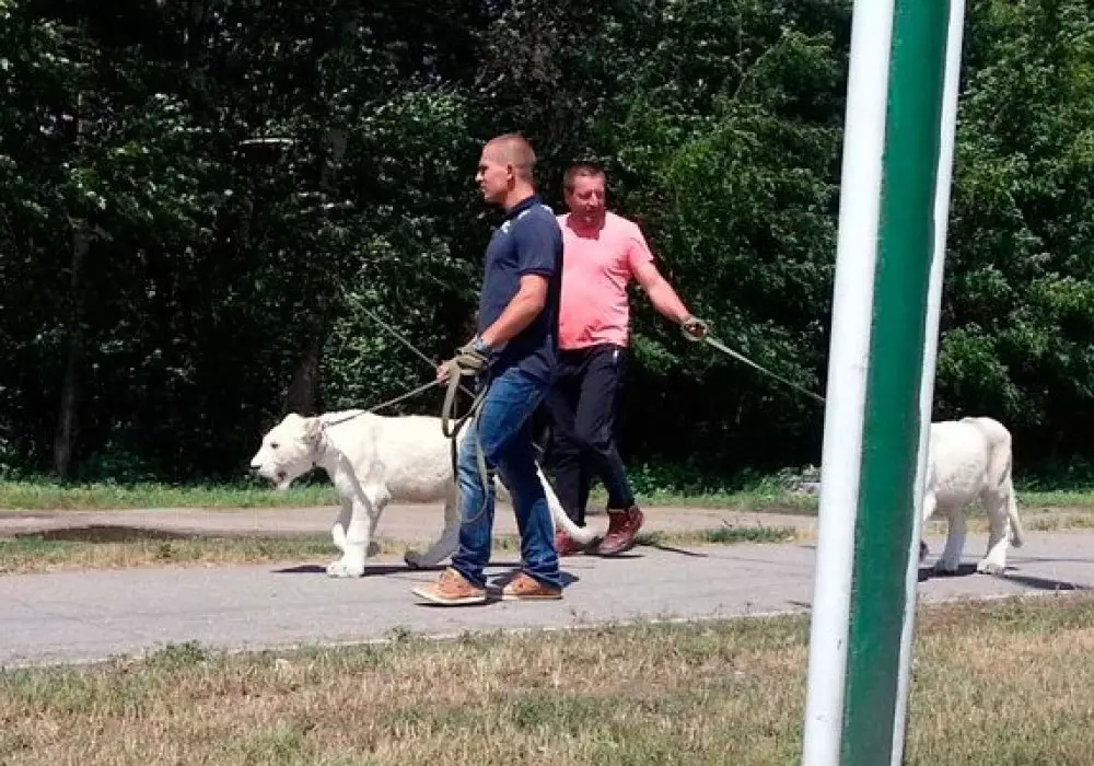 Как оказалось, двое белых львят, которым еще нет и года, принадлежат "Цирку Демидовых", который сейчас расположен на Комсомольском острове. Их прогулку на поводках сфотографировал один из водителей из окна машины.