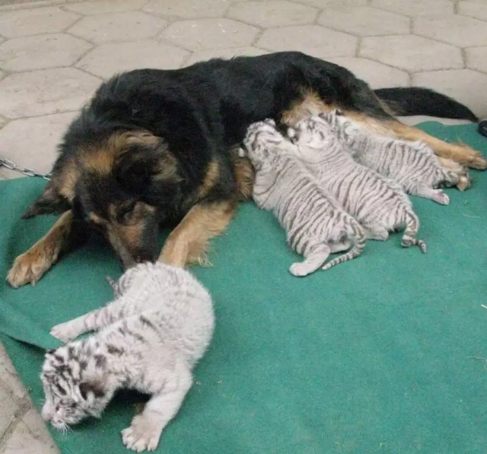 В Китае трех маленьких тигрят "усыновила" немецкая овчарка, сообщает BBC. Она вскармливает малышей, так как матери тигрят это не под силу. Это третий помет хищницы за последние полтора года.