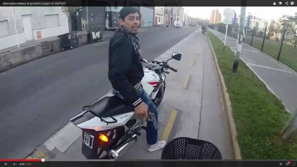 Снятый на видео инцидент произошел в столице Аргентины Буэнос-Айресе. К передвигавшемуся по одному из районов города велосипедисту подъехал грабитель на мотоцикле, показал пистолет и потребовал отдать рюкзак. Велосипедист попытался проигнорировать налетчика и продолжить свой путь, но вымогатель блокировал дорогу. Тогда мужчина бросил велосипед и спасся бегством. Позднее велосипед ему доставили прохожие, ставшие очевидцами ограбления. Все происходящее зафиксировала видеокамера, размещенная на шлеме потерпевшего.