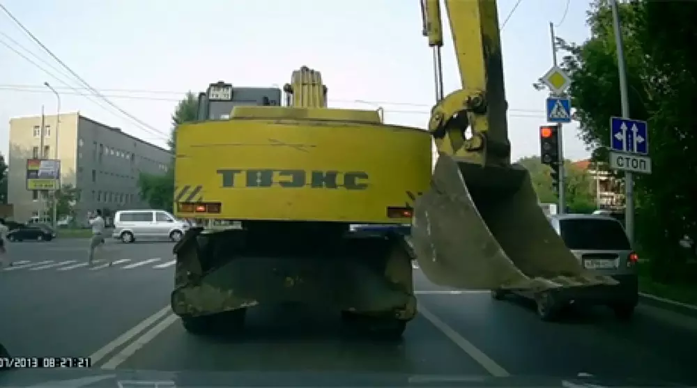 На видео запечатлено, как два экскаватора остановились перед красным сигналом светофора. Затем позади стоявший стальной землекоп подъехал ближе и ковшом легонько дотронулся до фары экскаватора своего коллеги, которая не работала. Как ни странно, фара от небольшого толчка загорелась.