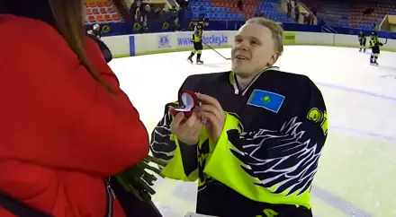 Вратарь ХК "Темиртау" оригинально предложил руку и сердце возлюбленной Скриншот с youtube.com