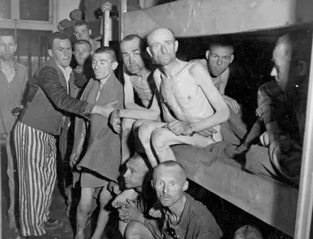 Заключенные концентрационного лагеря смерти Флоссенбург (Flossenburg) после освобождения 97-й пехотной дивизией армии США в мае 1945 года. Изможденный заключенный в центре - 23-летний чех - болен дизентерией. Лагерь Флоссенбург находился в Баварии возле одноименного города на границе с Чехией. Был создан в мае 1938 года. За время существования лагеря через него прошли около 96 тысяч заключенных, из них более 30 тысяч скончались в лагере.