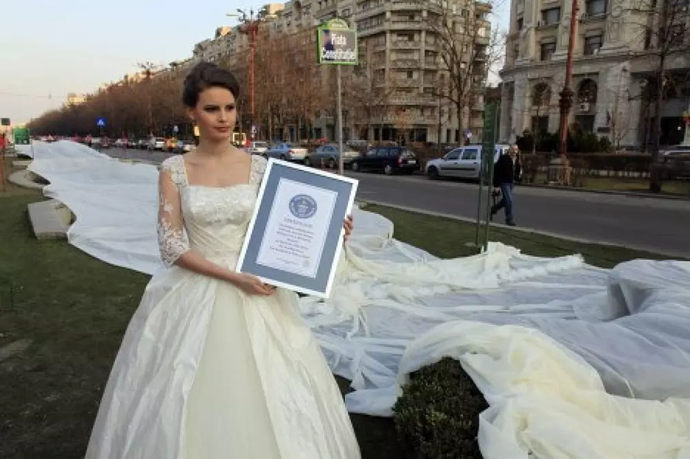 Презентация платья, которое уже вошло в Книгу рекордов Гиннесса, состоялась в Бухаресте в рамках ежегодной свадебной ярмарки. Стоит отметить, что над нарядом более трех месяцев трудились 10 портных. Шлейф длиной 2 километра 750 метров побил предыдущий рекорд, который составлял 2488 метров. Для того того, чтобы произвести еще большее впечатление на зрителей, невесту подняли над землей.
