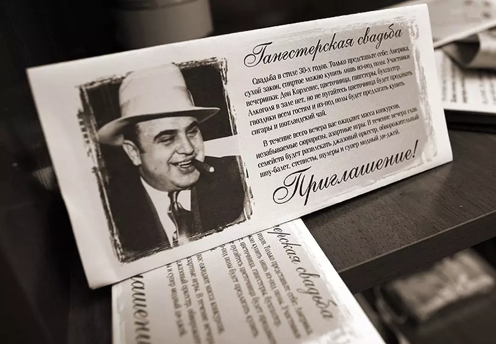 По словам менеджера компании, на "гангстерскую свадьбу" гости приходят в костюмах бандитов. Молодожены подбирают себе праздничный туалет в таком же стиле. На втором месте рейтинга популярности - свадьбы стиляг. Жених и невеста одеваются так же, как представители молодежной субкультуры в СССР конца 1940-х - начала 1960-х годов. Тогда в моде были яркие ткани, цветочные принты, пышные юбки и лифы, обтягивающие грудь.