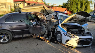 Кадр из видео Фура снесла полицейское авто на блокпосту в Костанайской области