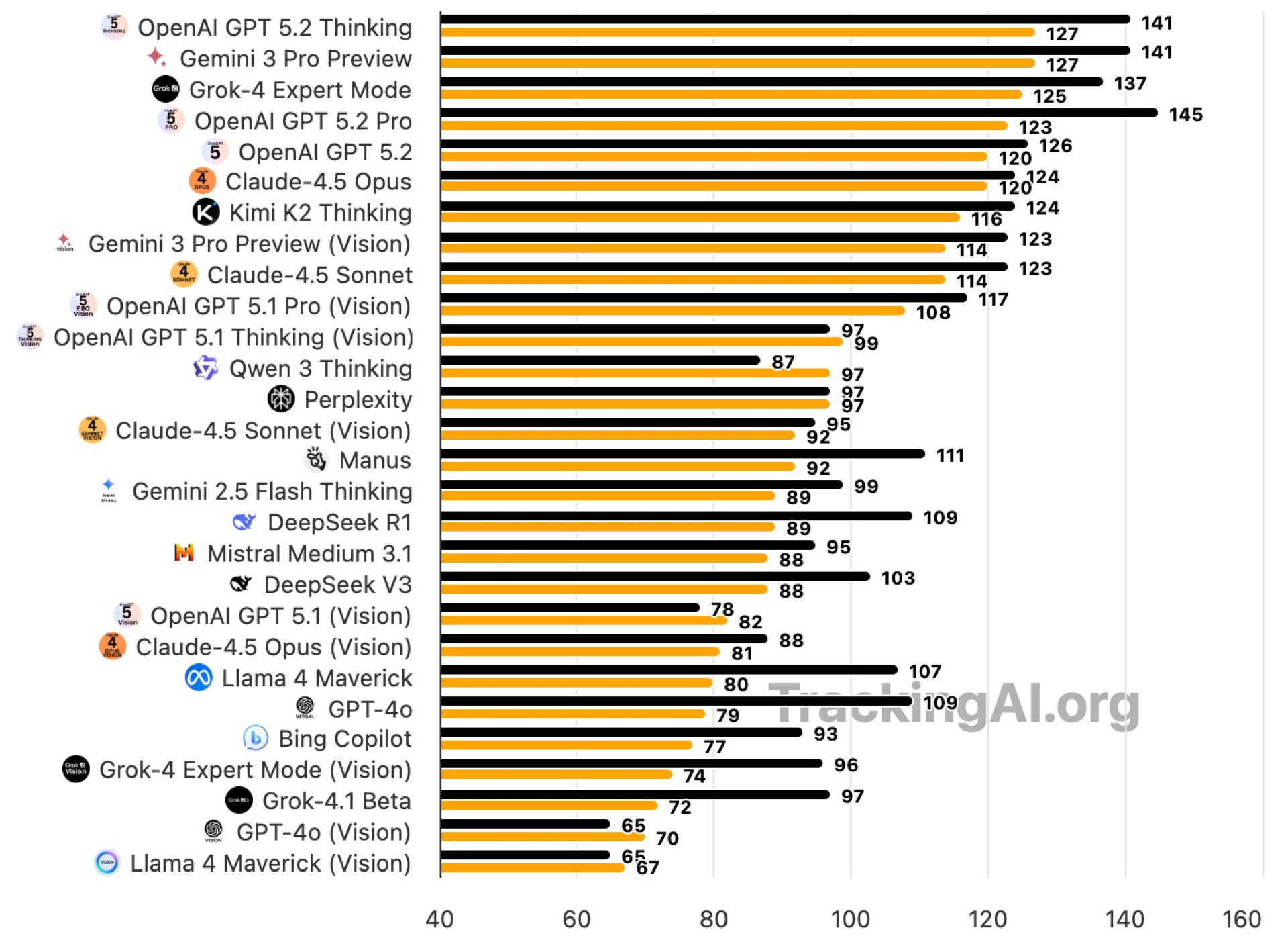 Лидерами списка стали GPT-5.2 Thinking и Gemini 3 Pro, которые разделили первое место, показав одинаковые результаты сразу в двух тестах. В классическом онлайн-тесте Mensa Norway обе модели набрали по 141 баллу, а в закрытом офлайн-тестировании — по 127 баллов.