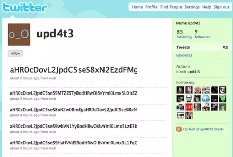 Хакеры использовали популярную систему микроблогов Twitter для того, чтобы отдавать команды сети зараженных компьютеров, так называемому ботнету, говорится на сайте компании Arbor Networks, занимающейся анализом IT-безопасности. Эксперт по безопасности Хосе Назарио случайно обнаружил аккаунт Twitter, который использовался как импровизированный сервер для получения обновлений вредоносных программ. Учетная запись upd4t3 использовалась для публикации коротких сообщений непонятного содержания. После того, как инженер расшифровал посты декодером base64 выяснилось, что сообщения представляют собой ссылки на серверы, с которых получали обновления вредоносные программы, установленные на некоторых компьютерах. Также Назарио обнаружил ссылку на адреса, использованные для получения информации с зараженных компьютеров. Целью ботнета является именно кража информации. Эксперт обратился в администрацию сайта, после чего микроблог был закрыт. Эксперт нашел еще два аккаунта, которые, предположительно, использовались для подобных целей. Этот случай является первым использованием Twitter для управления ботнетом. До этого хакеры использовали для рассылки команд чаты и пиринговые сети.
