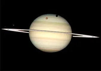 24 февраля этого года космический телескоп Хаббл (NASA/ESA Hubble Space Telescope) сделал редкий снимок четырех спутников Сатурна на той стороне, которая обращена к Земле, сообщает NASA Jet Propulsion Laboratory. Это редкое явление происходит лишь в том случае, если кольца Сатурна лежат практически в одной плоскости с положением земных наблюдателей. Такое прохождение колец Сатурна через плоскость наблюдения происходит с периодичностью 14 – 15 лет. В 1995-1996 годах Хаббл уже наблюдал подобное положение колец Сатурна. Тогда это помогло открыть несколько новых лун планеты. Начало 2009 года было благоприятным временем для наблюдения за шестой планетой Солнечной системы. Даже с непрофессиональных телескопов можно было видеть прохождение спутников Сатурна вдоль своих орбит. Титан, самый крупный из них, пересекал поверхность планеты четыре раза.