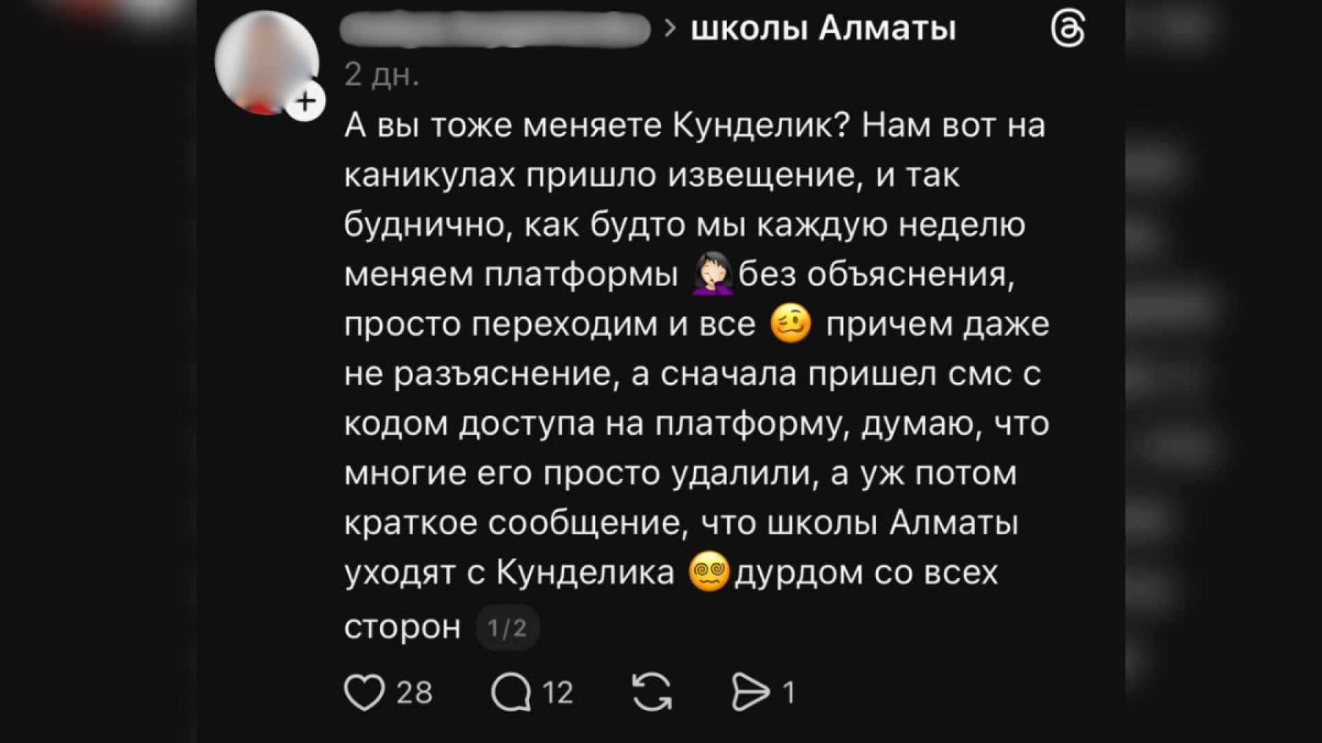 "Нам на каникулах пришло извещение, и так буднично, как будто мы каждую неделю меняем платформы. Без объяснения, просто переходим — и всё. Сначала пришло SMS с кодом доступа на платформу, а уже потом — краткое сообщение, что школы Алматы уходят с "Kundelik".