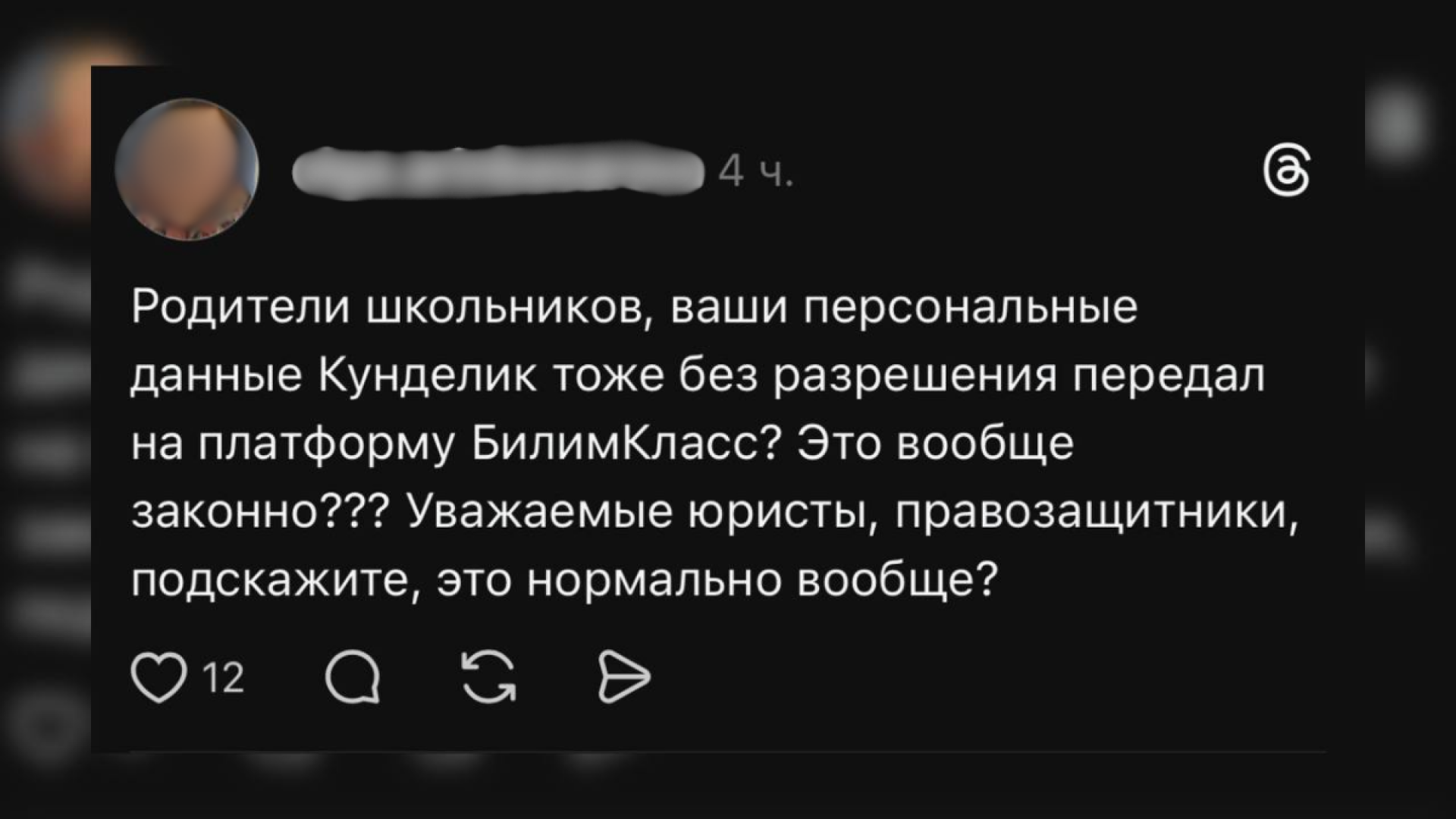 "Родители школьников, ваши персональные данные "Kundelik" тоже без разрешения передал на платформу "BilimClass"? Это вообще законно? Подскажите, это нормально вообще?" – задаются вопросом пользователи в сети.