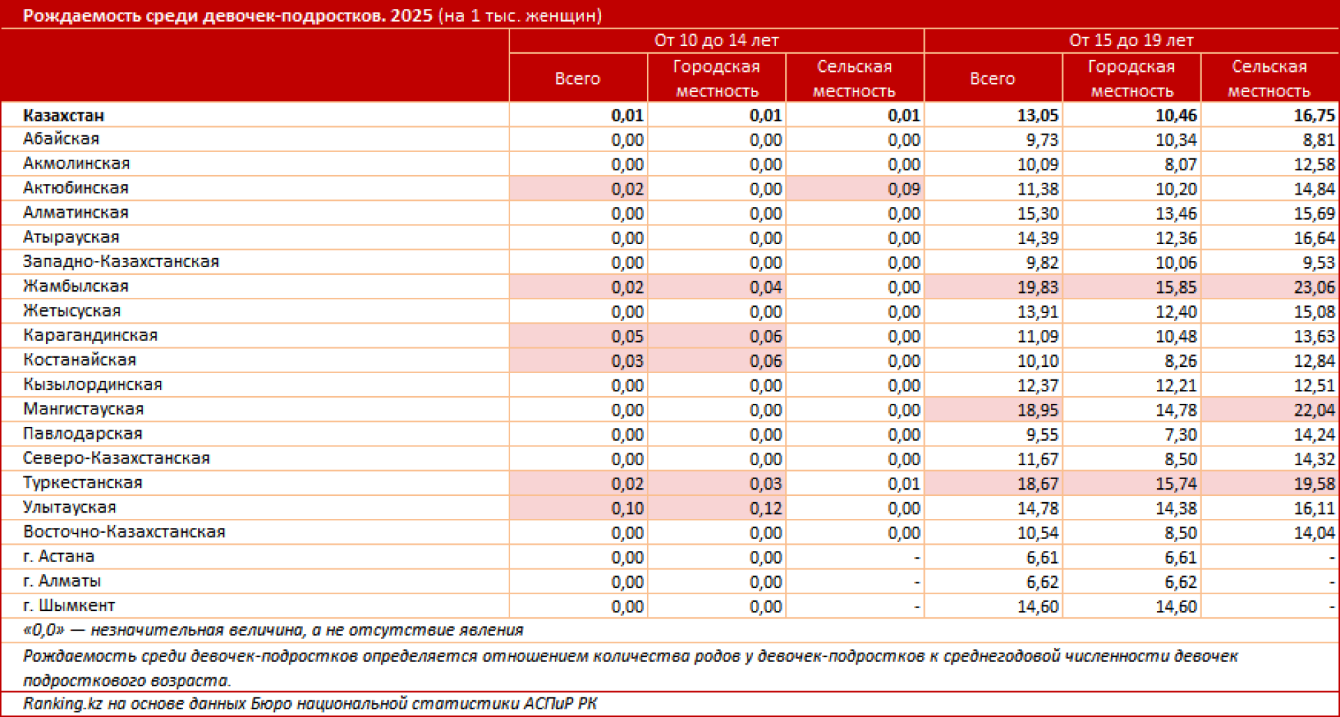 По данным исследования, в 2025 году коэффициент рождаемости среди девочек 15–19 лет в среднем по Казахстану составил 12,96 на тысячу девушек.
