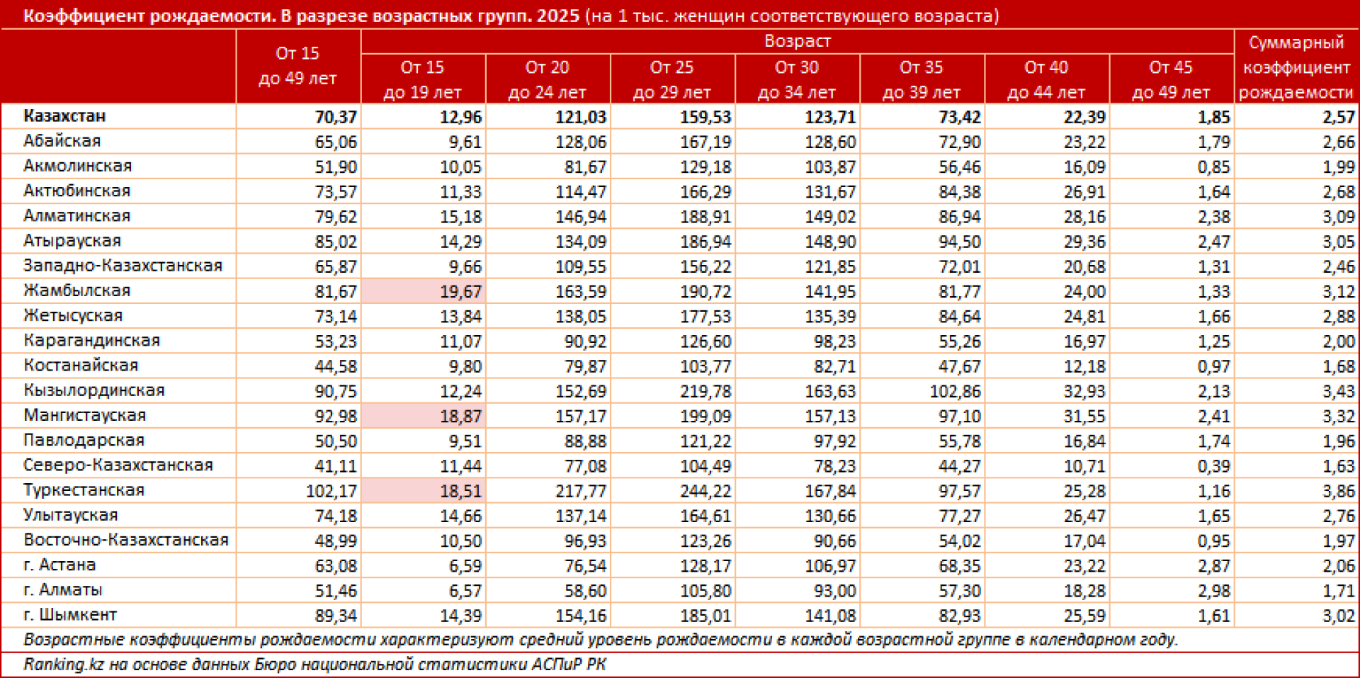 Основные роды здесь приходятся на возраст 25–34 лет, тогда как в Туркестанской области пик смещён к более молодым группам — от 20 до 29 лет.