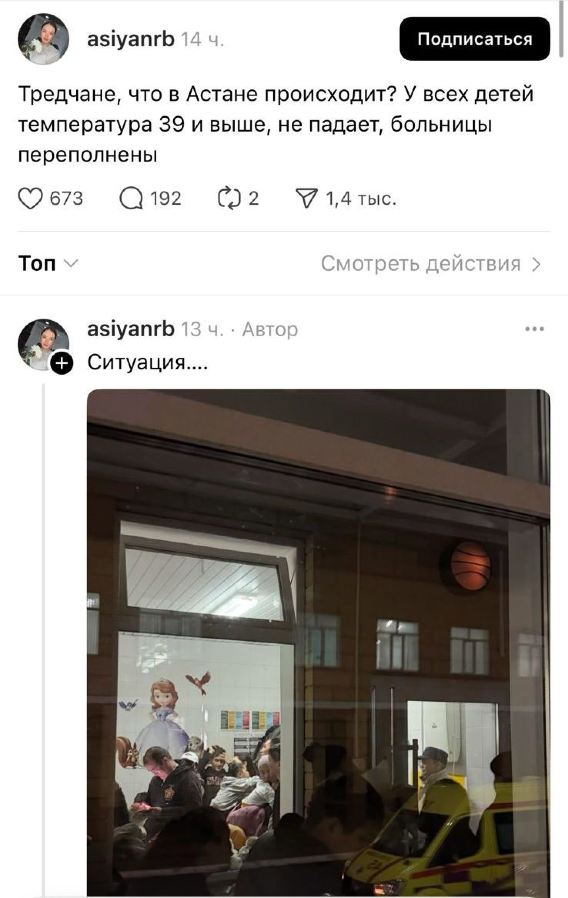 В сети жители Астаны массово жалуются на симптомы очередного вируса: на затяжную высокую температуру и невозможность быстро попасть на прием к врачу. Люди пишут, что температура у детей и вовсе держится по 5–7 дней, а больницы и поликлиники переполнены.