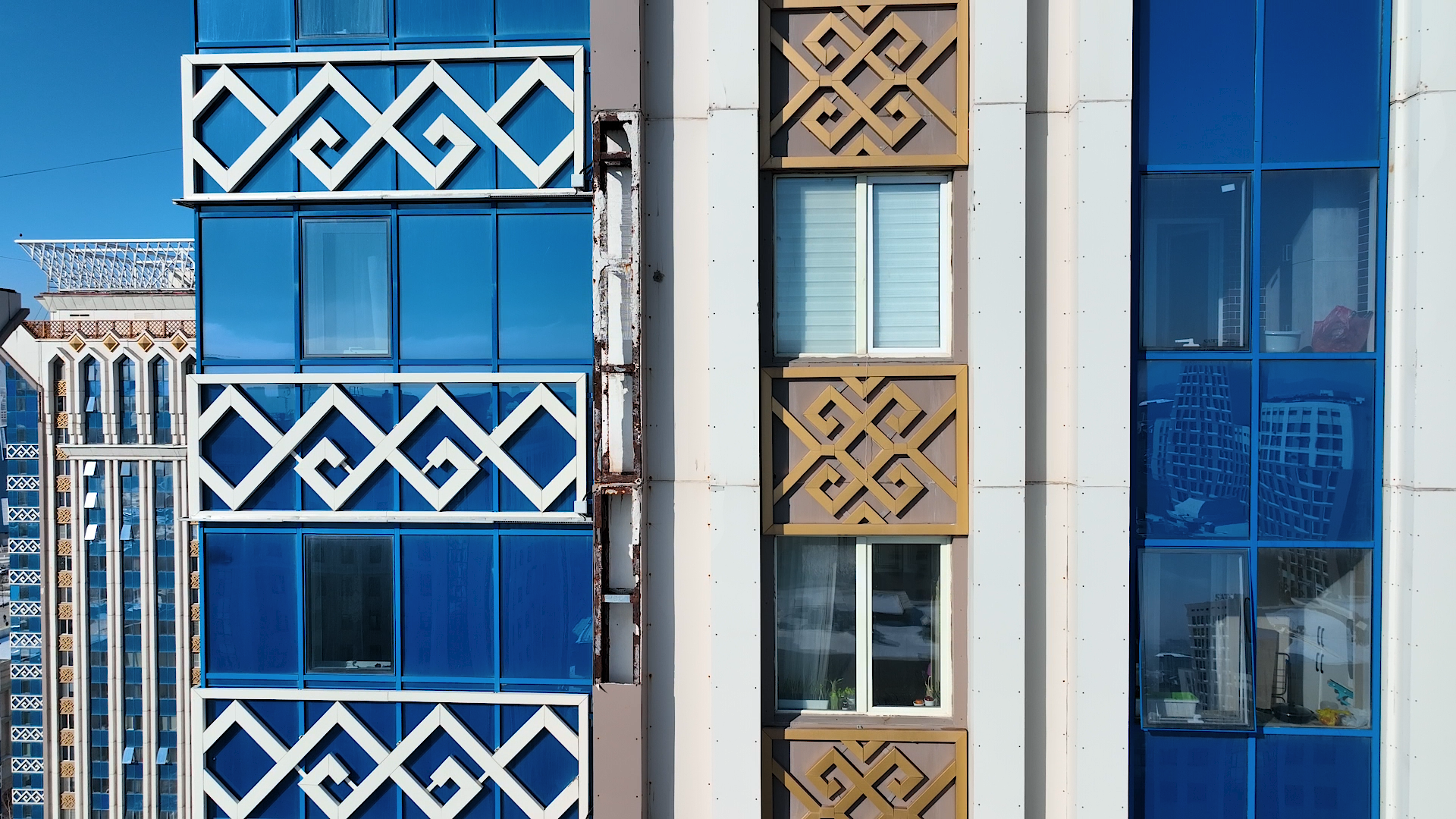 Взгляды прохожих ЖК привлекает не только национальным стилем и орнаментами, но и коронами, украшающими каждую башню. Сегодня подобная архитектура в Астане почти не встречается: новые высотки выглядят однотипно.
