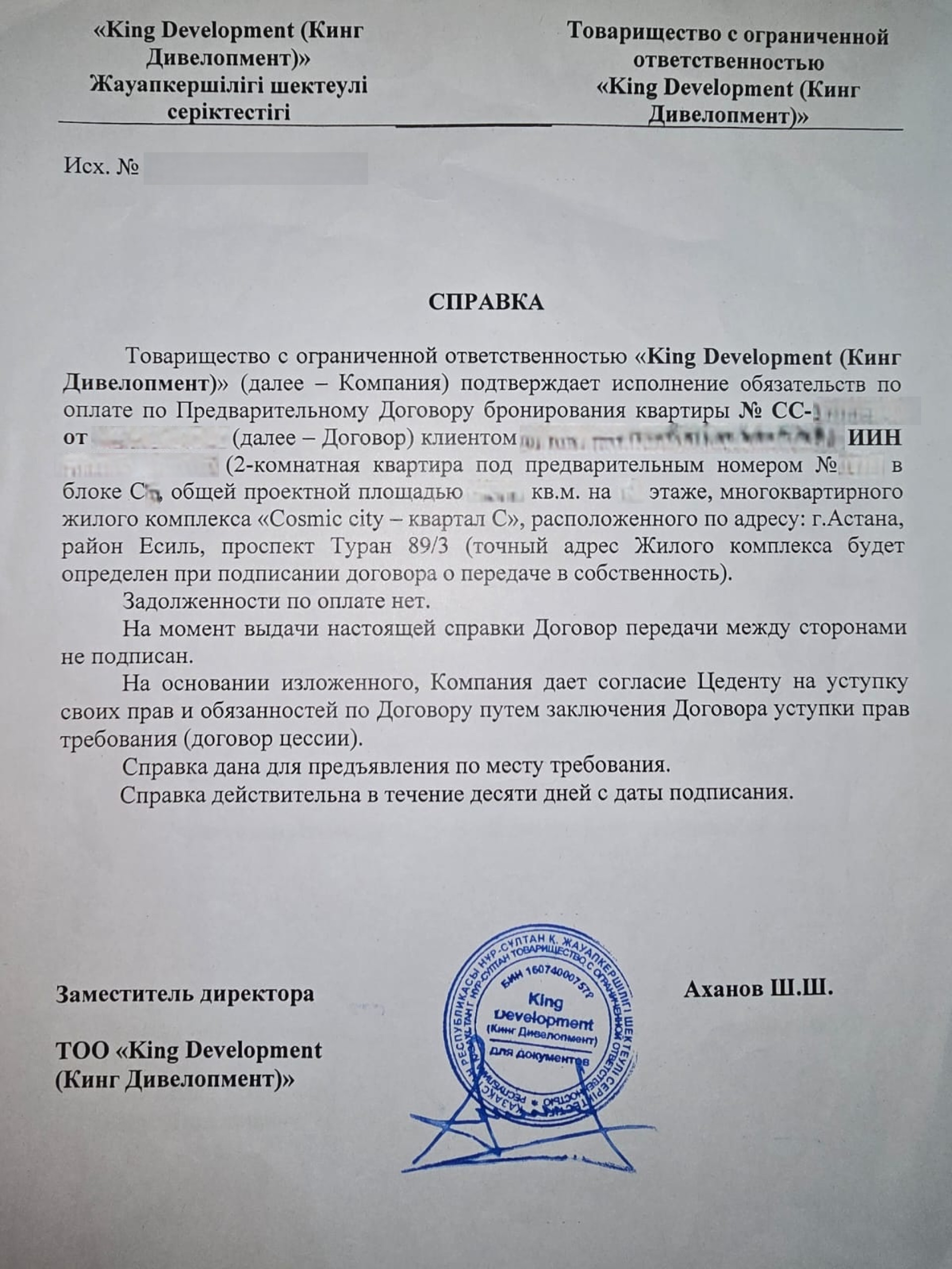 В King Development также поясняют, что выданные справки не являются правоустанавливающими документами и лишь подтверждают отсутствие вопросов по конкретной квартире на определённый момент. Регистрация права собственности возможна только после ввода дома в эксплуатацию.