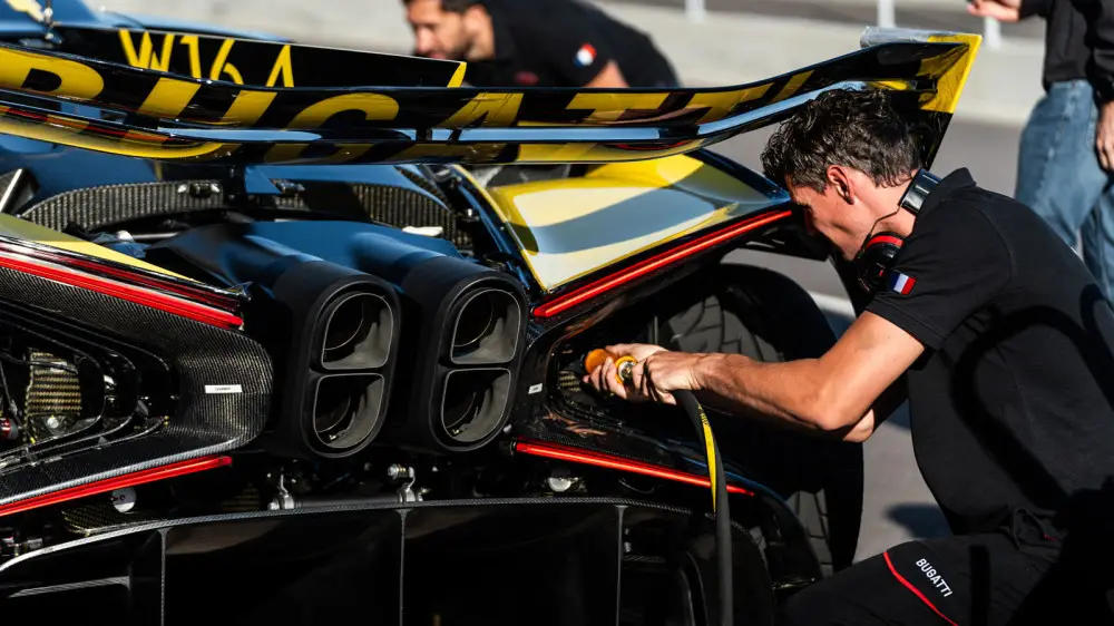 На испытательном полигоне инженеры Bugatti детально оценивают каждый элемент Bolide, проверяя его аэродинамику, управляемость и производительность. Автомобиль, оснащенный 8-литровым двигателем W16, демонстрирует исключительную динамику, что делает его одним из самых экстремальных трековых гиперкаров бренда.