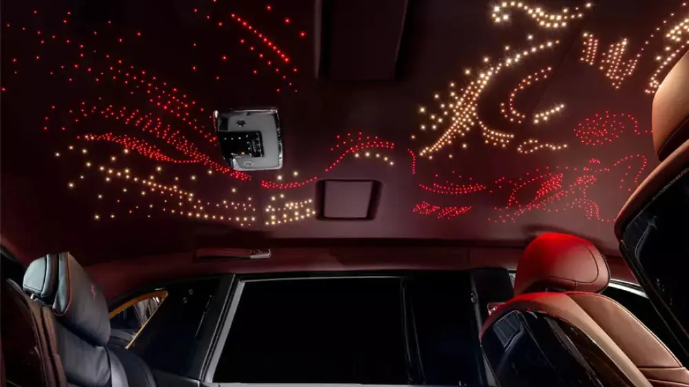 Основная тема оформления салона – легенда о двух драконах, которые получили жемчужину от богов за добрые дела. В интерьере седана внимание привлекает потолок Starlight с изображением звездного неба, где представлены красный и белый драконы, созданные с помощью более 1300 оптоволоконных световодов.
