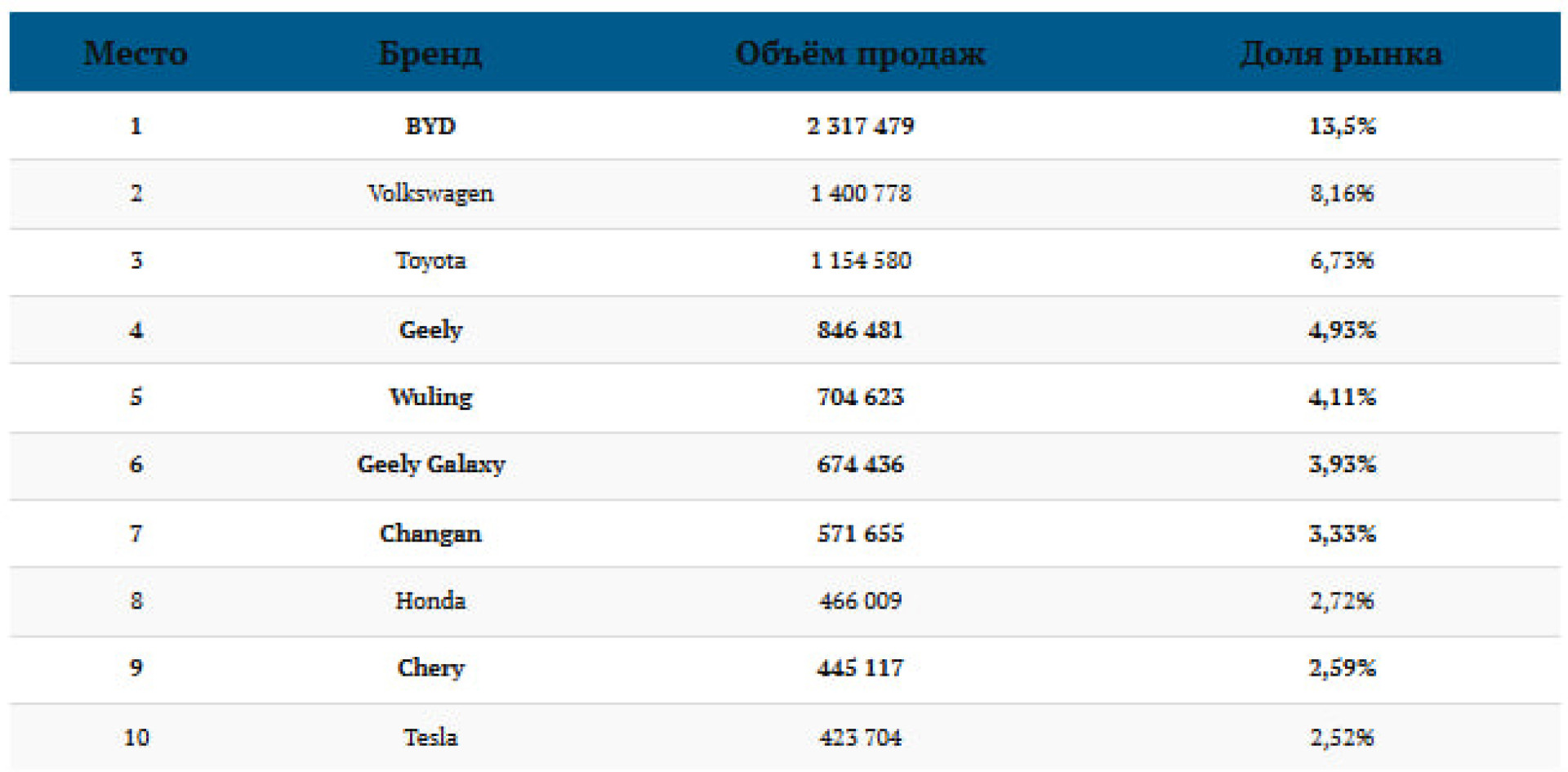 Changan, продвинувшись на седьмое место, продала 571,6 тысячи авто, опередив Honda, занявшую восьмую позицию. Девятое место досталось Chery с 445,1 тысячи авто, а Tesla замкнула десятку лидеров.