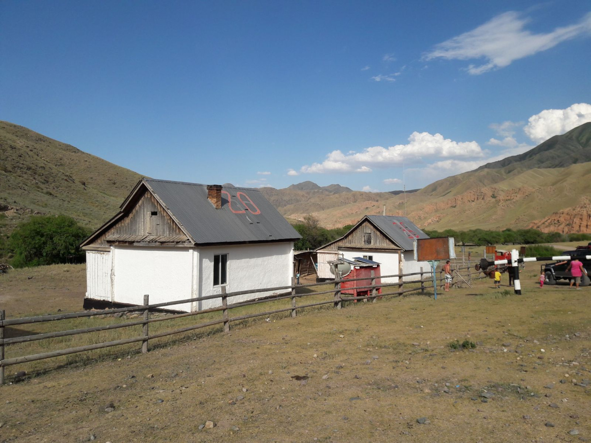 Грунтовая дорога тянется прямо через равнину, вдоль горной реки. По пути встречаются броды, один из них довольно глубокий. По обе стороны, а иногда и прямо на дороге, пасутся большие стада — коровы, лошади, овцы и козы.